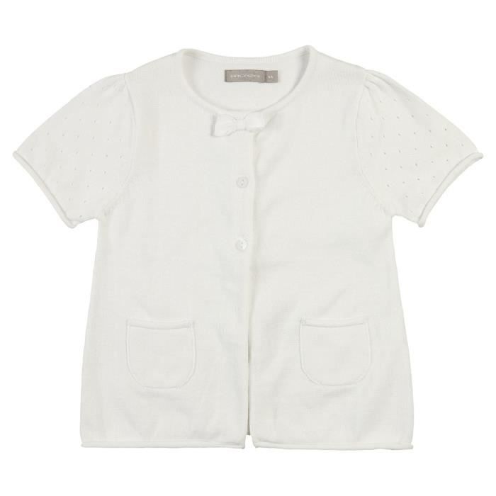 Cardigan col arrondi, 100 % coton, blanc. Maille jersey, maille ajourée aux manches, bords roulottés, 2 poches plaquées, boutons, noeud fantaisie.