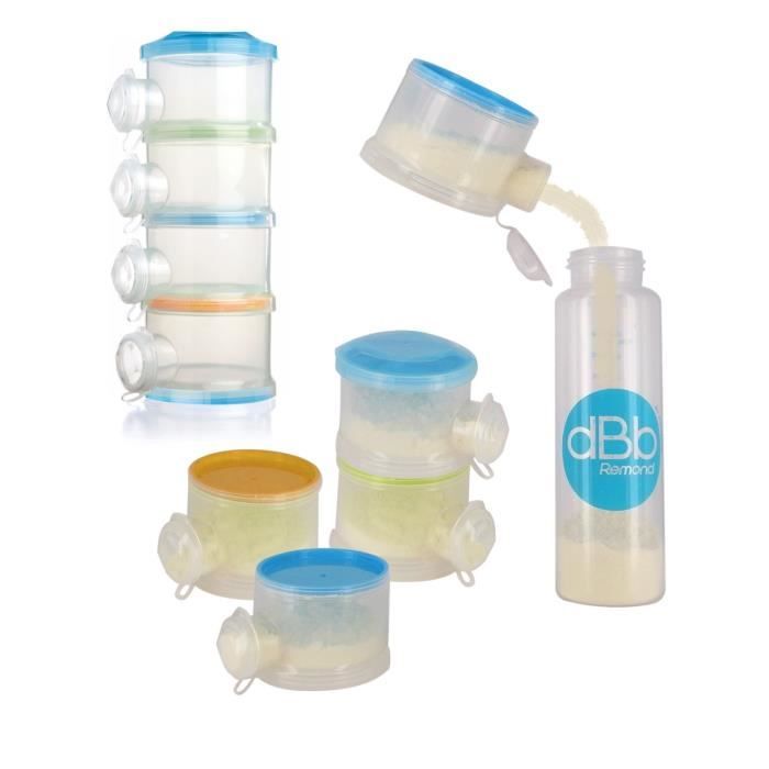 Tour de 4 boîtes doseuses de 90grs avec bec verseur - Chaque bec verseur est fermé par un bouchon et peut s'utiliser séparément ou emboité l'un sur l'autre - Polypropylene Sans Bisphénol A - Translucide pour le corps, de couleur pour le fond et le couvercle - Passe au lave-vaisselle et a la stérilisation - Livré a l'unité
