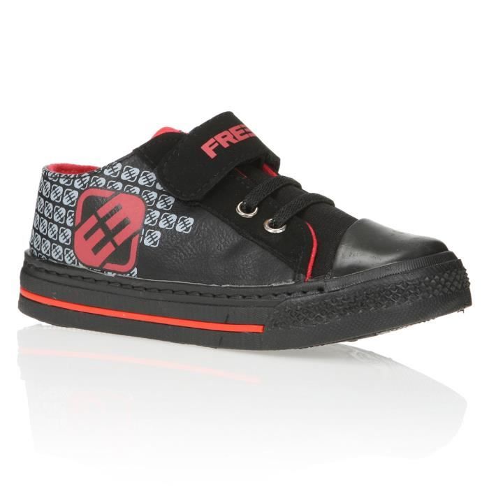 Baskets basses en synthétique imprimé, coloris noir et rouge. Fermeture a lacets et bande scratchée.