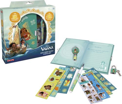 Retrouve Vaiana la nouvelle Princesse des îles de Disney dans ton carnet secret. Ouvre ton carnet pour écrire tous tes secrets. Utilise le stylo pour marquer tous tes messages à lintérieur. Puis, personnalise les pages en collant les stickers. Super ! Fais scintiller ton carnet grâce aux stickers brillants. Ton carnet a même un cadenas pour garder précieusement tes secrets !
