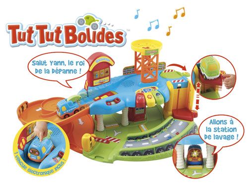 Tut Tut Bolides - Mon garage éducatif (1-5 ans) Un garage interactif pour jouer avec les Tut Tut bolides Magique, quand le véhicule sarrête au centre de contrôle, cest magique il est reconnu automatiquement et accueilli joyeusement « Salut, Barnabé, super pompier ! » Pour découvrir les couleurs, la météo, deux chansons amusantes et des sons réalistes Ce garage complet avec une station de lavage, une pompe à essence, une rampe daccès est truffé de surprises ! Un ascenseur et un disque à tourner pour découvrir les opposés- Le garage reconnaît lensemble des Tut Tut Bolides 1 véhicule électronique (Yann, le roi de la dépanne) inclus 6 mélodies et 2 chansons 3 piles LR6 fournies ( 2 pour le garage et 1 pour le véhicule)