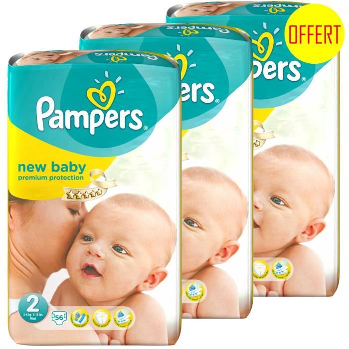 2 achetés, le 3eme de ce lot OFFERT ! Remise déja déduite. Les couches Pampers New Baby de la gamme Premium Protection(TM) : la meilleure protection pour la peau de votre nouveau-né. Matelas absorbant plus long pour une meilleure protection a l'arriere. Douces comme du coton, elles apportent tout le confort nécessaire. Découpe spéciale cordon ombilical et ceinture plus haute dans le dos. T2. 3 a 6 Kgs. 3x56 couches.