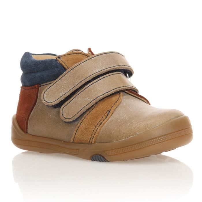 Baskets Bébé tige moyenne en cuir lisse et daim beige foncé, camel, marron et bleu. Fermeture par scratchs.