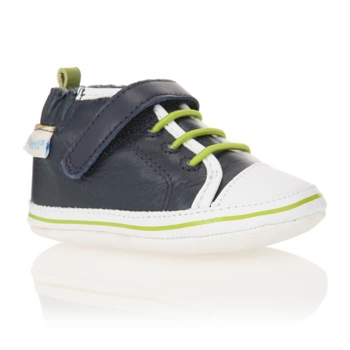 Chaussons a la tige basse en cuir de qualité entierement doublé avec une bande élastique a la cheville et une semelle antidérapante en suede texturé, coloris marine, blanc et anis. Fermeture par lacets élastiqués et patte auto-agrippante.
