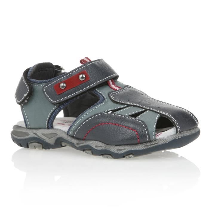 Sandales en synthétique avec surpiqûres contrastantes, coloris marine et gris. Fermeture par brides scratchées.