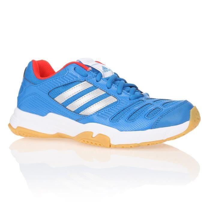 Chaussures de badminton avec tige en synthétique et textile, bleu et blanc, semelle intérieure en textile, semelle extérieure en caoutchouc, fermeture par lacets.