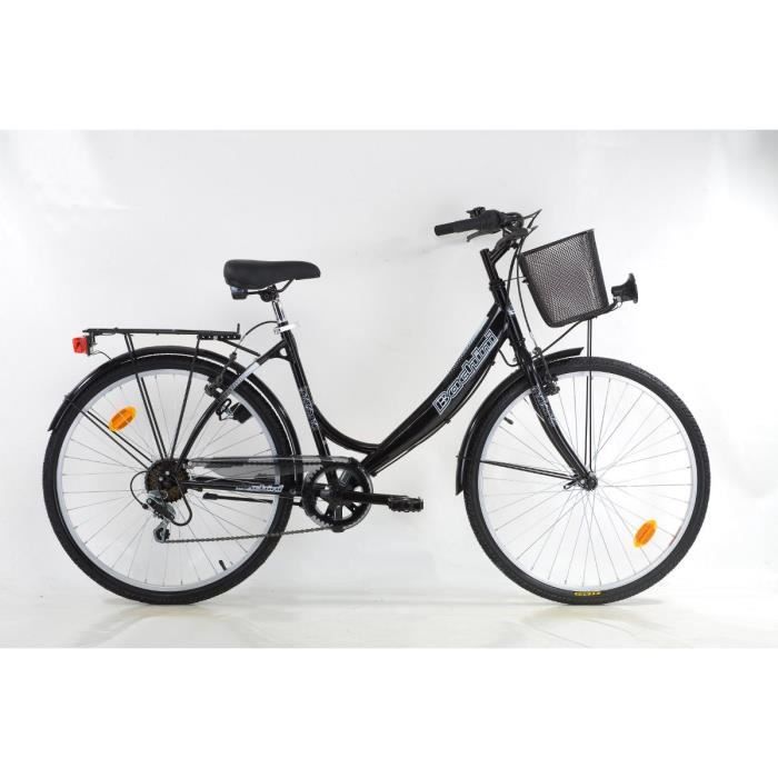 Modele Indiana. Coloris: noir. Vélo de ville Femme 26", 6 vitesses. Vélo équipé d'un garde-boue, d'un porte-bagages arriere, d'un panier avant et d'une béquille. Vélo ville conçu pour des déplacements urbains réguliers avec dénivelé moyen.