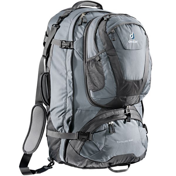 Sac a dos de voyage gris et noir, compartiment principal, 2 poches frontales sur l'avant, 1 poche zippée dessus, 2 poches filet latérales pour accessoires. 2 poignées de transport et bandouliere avec appui d'épaule.