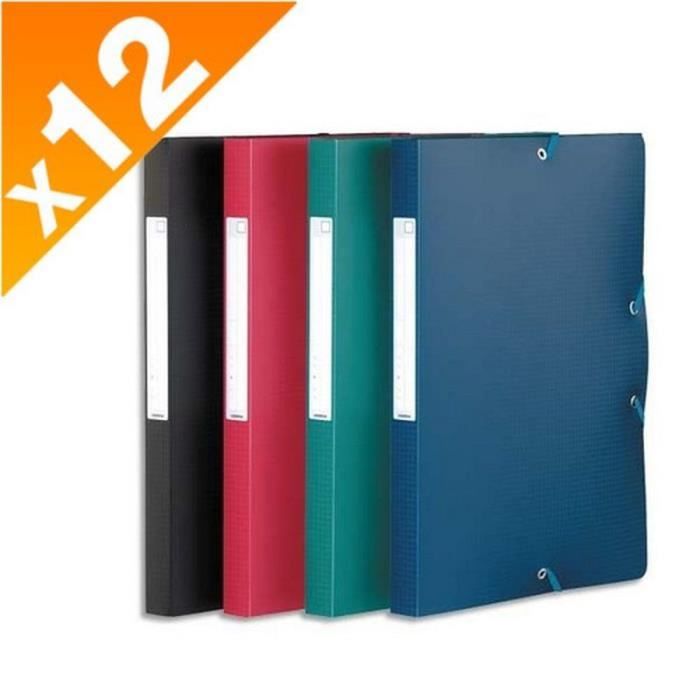 En polypropylene 7/10e, grain exclusif et toucher satiné Fermeture par élastique. Dos formé 2,5 cm, avec étiquette. Assortis tradition : bleu, rouge, noir, vert. Assortis style : bleu lavande, violet, vert anis, mais. Assortis tradition Dimensions : 24 x 32 cm.