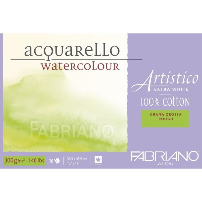 Bloc collé 4 côtés papier aquarelle Artistico Extra White, 30,5x45,5 cm, grain torchon, 300 g/m², 20 feuilles. Papier 100% coton réalisé sur forme ronde. Sans acide et avec reserve alcaline pour lui donner une excellente conservation dans le temps. Idéal pour l'aquarelle et toutes les techniques humides et seches.