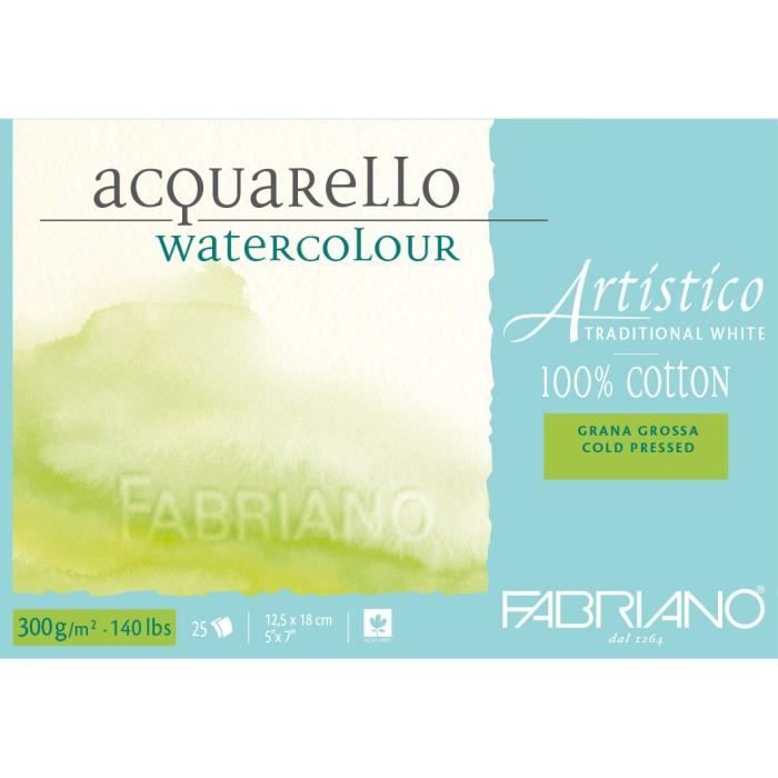 Bloc collé 4 côtés papier aquarelle Artistico Traditional White, 12,5x18 cm, grain torchon, 300 g/m², 25 feuilles. Papier 100% coton réalisé sur forme ronde, gélatiné a coeur et en surface. Sans acide et avec reserve alcaline pour lui donner une excellente conservation dans le temps. Idéal pour l'aquarelle.