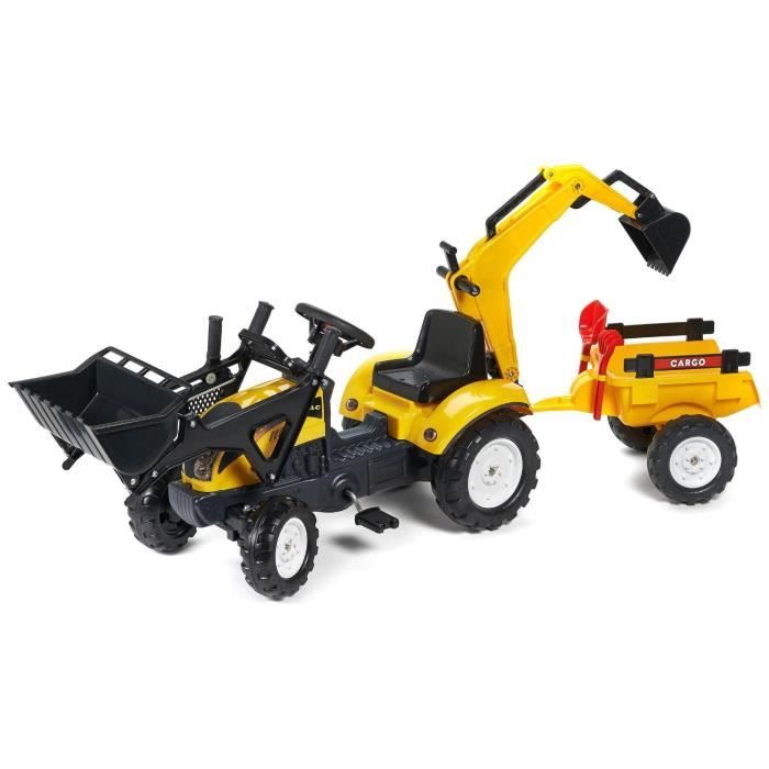 Possede une pelle frontale articulée, une remorque et une pelle excavatrice arriere entierement articulée. Son volant est équipé d'un klaxon. Garçon. De 2 a 5 ans. Livré a l'unité.