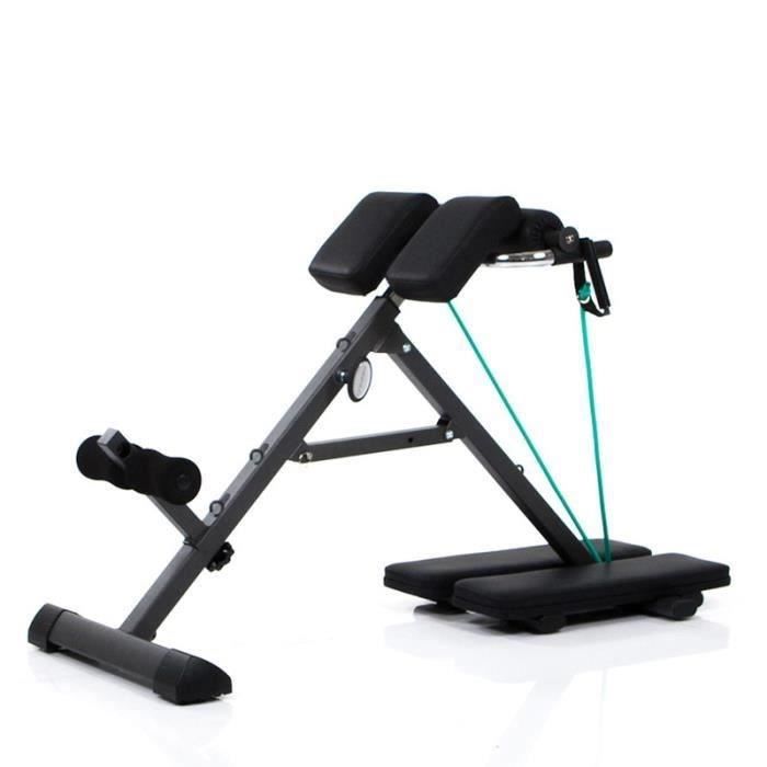 Planche a abdominaux Physio Pro, aluminium et plastique, gris et noir, doté de 5 crochets pour changer la position de l'élastique et pour varier l'intensité des exercices, poignées ergonomique, hauteur réglable. Dimensions : 145 x 52 x 96 cm.