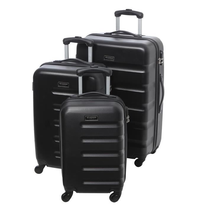 Set de 3 valises trolley 4 roues en ABS noir. Formats : cabine, intermédiaire et maxi. Systeme trolley intégré a boutons poussoir et poignée télescopique. Poignées de portage latéral et supérieur. Ouverture zippée a double curseur + cadenas a code intégré. Un compartiment avec plateau séparateur, double sangle élastique de maintien intérieur.