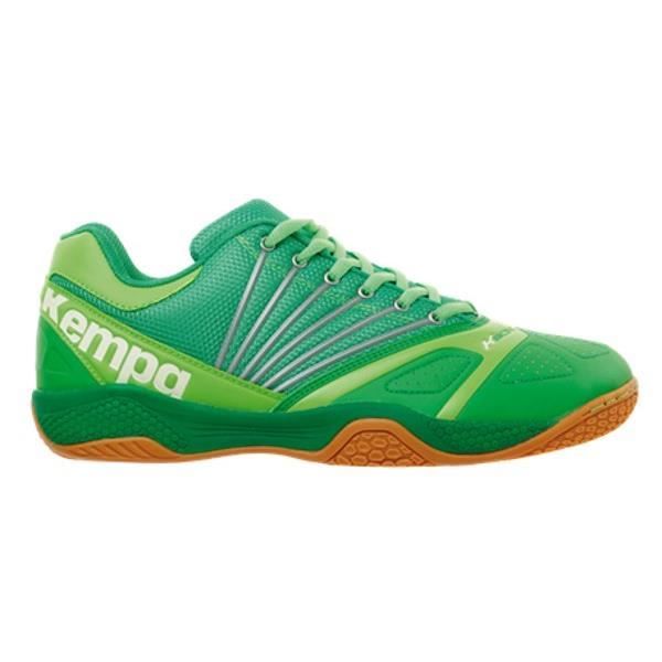 Chaussures de handball vertes, tige en textile respirant, construction de la tige permettant de fixer le métatarse, semelle intérieure en textile, semelle extérieure en caoutchouc, fermeture par lacets.