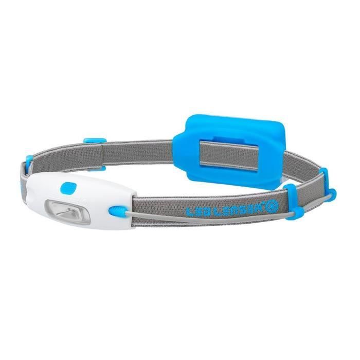 Lampe frontale avec un design compact et innovant, bleu et gris, autonomie 100 heures, 90 lumens, 54 grammes, portée de 10 m.