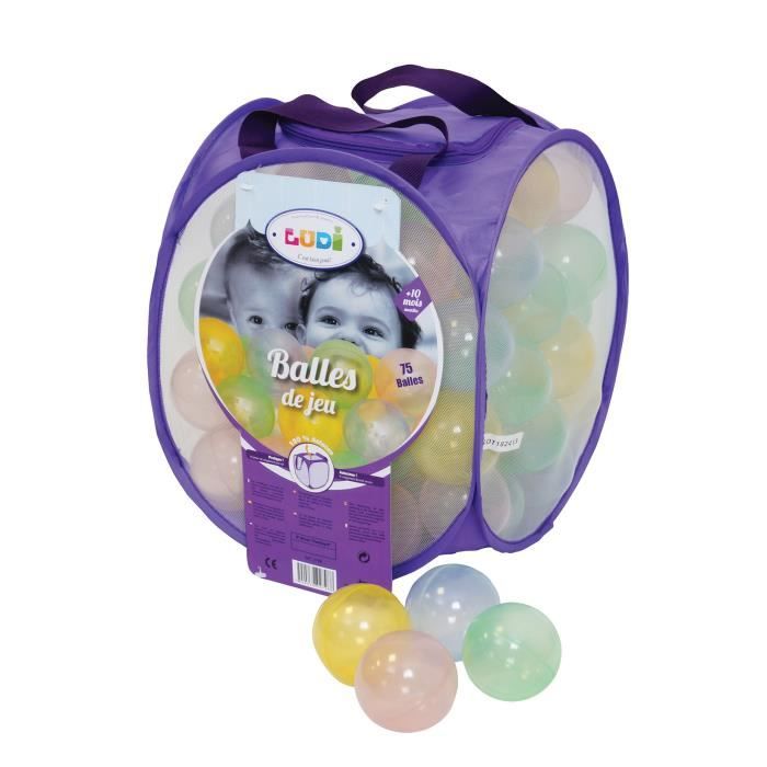 Ces 75 balles de jeu multicolores tout en transparence sont idéales pour compléter vos aires de jeu ou créer une piscine a balles. Elles ne sont ni trop grosses ni trop petites (6,5cm de diametre), permettant ainsi une bonne prise en main y compris pour les plus petits. Fournies avec un panier de rangement. Des 10 mois. Mixte - livré a l'unité