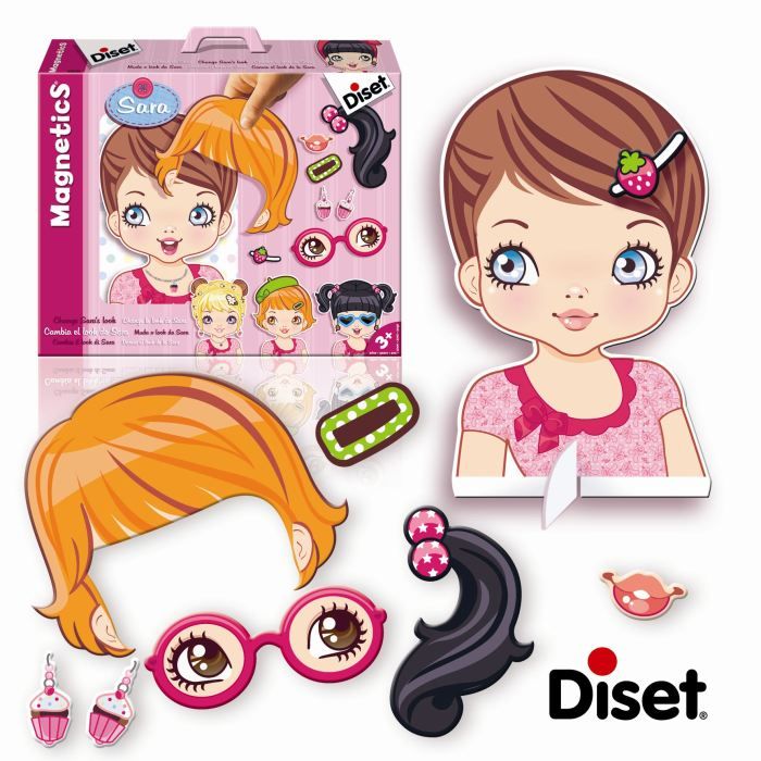 Diset - Les Coiffures De Sarah - Figurine en forme de visage de petite fille avec tous les accessoires pour créer différents looks et coiffures - Contient 3 planches d'accessoires magnétiques : coiffures, chapeaux, barrettes, boucles d'oreilles, lunettes - Fille - A partir de 3 ans - Livré a l'unité