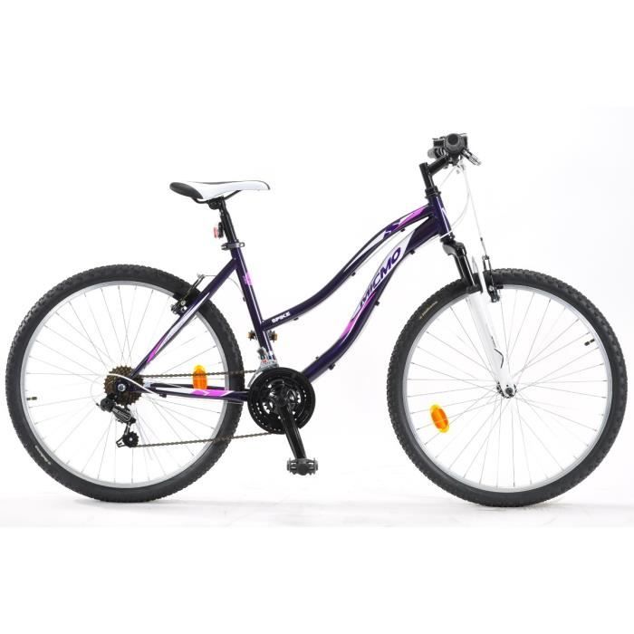 VTT avec cadre acier noir et rose, fourche a suspension, freins V-Brake acier, dérailleur arriere Shimano TY21, pneu tout terrain 26", jantes aluminium, manettes tournantes, 18 vitesses. Potence a plongeur et cintrage acier.