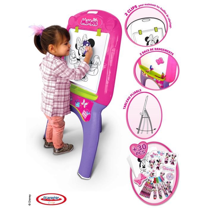 Tableau pliable donc peu encombrant. Face blanche effaçable et magnétique. Facilement démontable.2 clips pour accrocher les feuilles de papier. 2 bacs de rangement pour les accessoires. Livré avec un set créatif 30 pieces. Fille. A partir de 3 ans. Livré a l'unité.