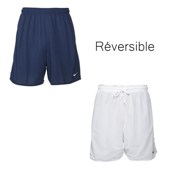 Short 100% polyester, blanc et bleu, réversible, taille élastiquée avec cordon de serrage.