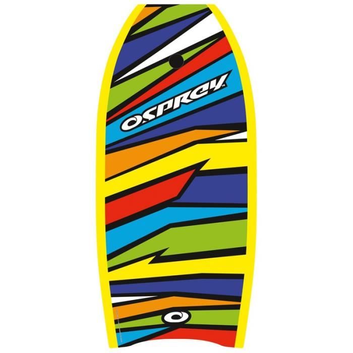 Bodyboard 42'' avec noyau EPS épaisseur 55 mm. Jaune avec motifs. Arriere "crescent". Deck XPE texturé. Channels. Semelle de glisse en Polyéthilene haute densité HDPE. Leash inclus