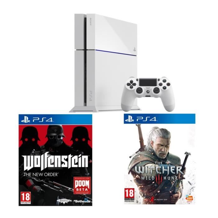 Le pack contient la PS4 500Go blanche + Wolfenstein, ainsi que le jeu PS4 The Witcher 3.
