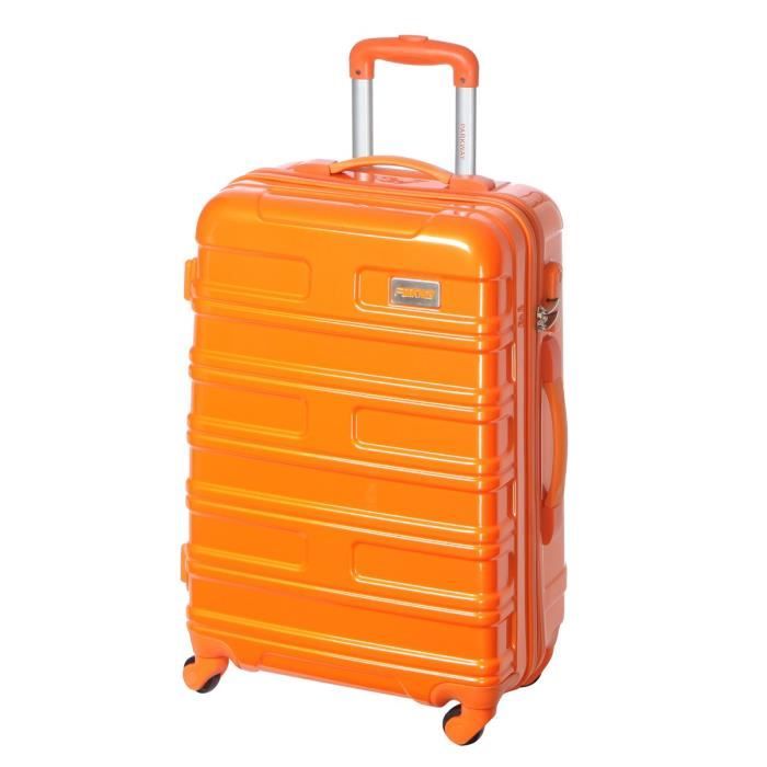Valise Trolley 4 roues en polycarbonate orange. Grand format. Systeme trolley intégré a bouton poussoir. Poignées fixes supérieure et latérale. Ouverture zippée a double curseur + cadenas a combinaison. Deux compartiments. Sangle de maintien et une poche zippée.