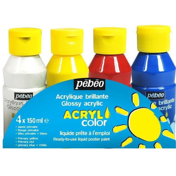 4 pots de peintures liquides acryliques brillantes 150 ml, couleurs primaires.