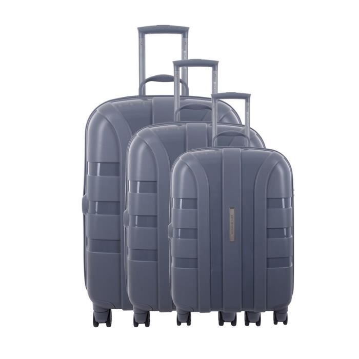 Set de 3 valises trolley 4 roues Incassables en polypropylene anthracite. Formats : cabine, intermédiaire et maxi. Systeme trolley intégré a boutons poussoir et poignée télescopique. Poignée rétractable avec dessus et côté. Ouverture zippée a double curseur + cadenas TSA. Un compartiment avec une poche filet zippée, double sangle de maintien intérieur.