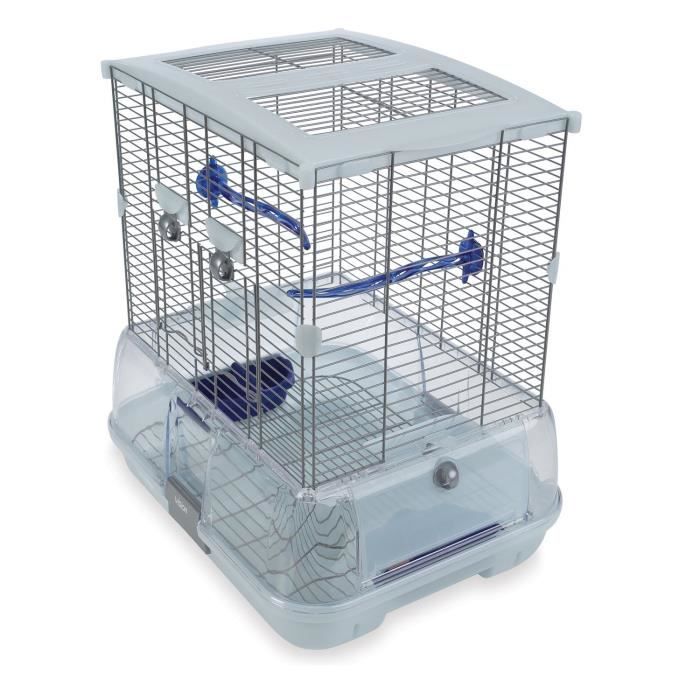 Cage Vision pour oiseaux - Design idéal pour l'installer dans les pieces de vie - Elles comportent de nombreuses caractéristiques de conception révolutionnaire qui les distinguent des autres cages pour oiseaux - Perchoirs et augets a eau et a nourriture bleus