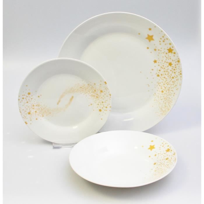 Service Porcelaine 18 pieces STARDUST GOLD comprenant 6 assiettes plates Ø24cm, 6 assiettes creuses Ø20,5cm et 6 assiettes a dessert Ø19cm - Forme AILE - Compatible micro-onde et lave-vaisselle.
