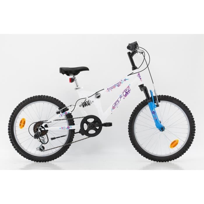 VTT cadre avec suspension centrale, blanc, fourche télescopique, 20", frein a disque avant, dérailleur arriere Shimano TY21, 6 vitesses, poignées PVC.