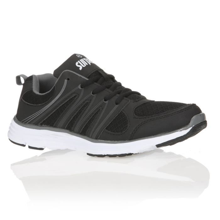 Chaussures Basses Running - Tige 70% PU 30% Mesh - noir - Doublure Graniture Intérieure 100% Mesh - Semelle extérieure 100% EVA - Fermeture par lacets. Chaussure de Running pour les coureurs a pied qui recherchent avant tout l'amorti et le maintien nécessaires pour la pratique 2 fois par semaine.