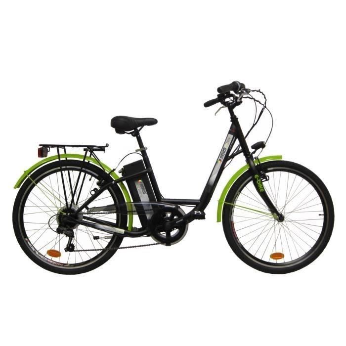 VAE avec cadre rigide acier, noir, moteur 24V-250Watt, dérailleur arriere Shimano TY21, manettes Saiguan 6 vitesses, potence acier plongeur, selle city confort, freins Vbrake, 3 fonctions avec aide de départ.