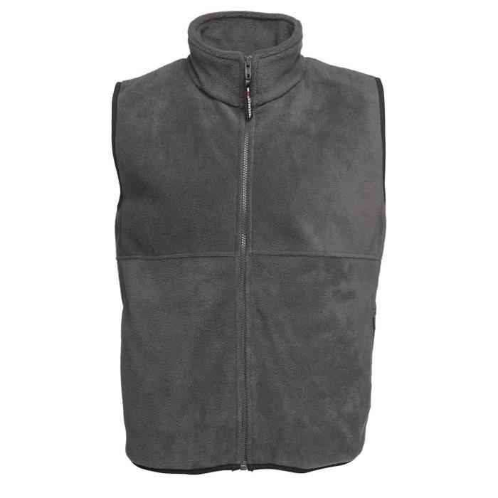 Polaire 100% coton, gris, col montant, fermeture zippée, 2 poches zippées. Sans manche.