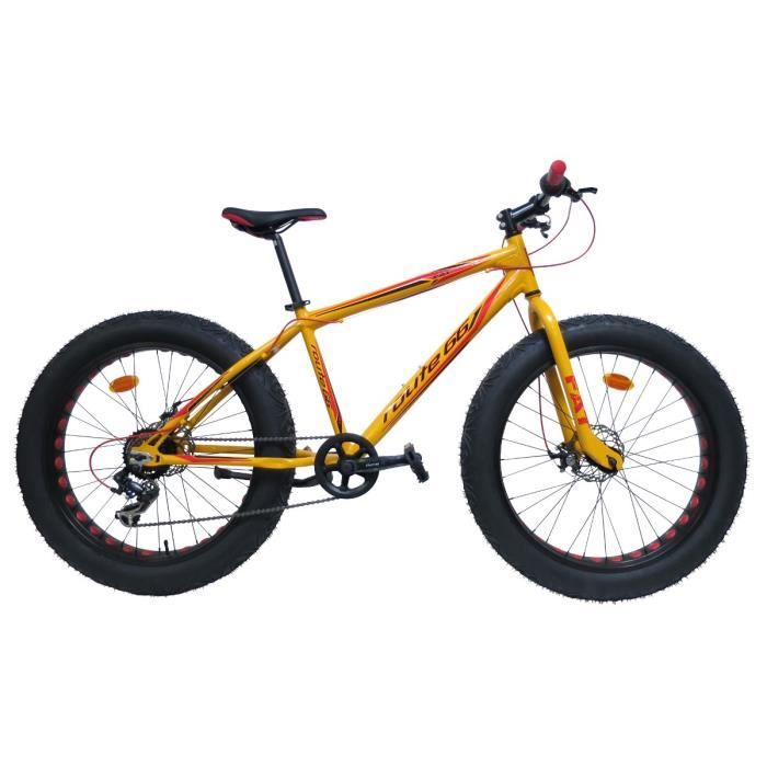 VTT avec cadre acier rigide, orange, fourche rigide, manettes Shimano - revoshit RS35, selle alu avec blocage rapide, dérailleur arriere Shimano TY21, freins avant et arriere a disque PROMAX.