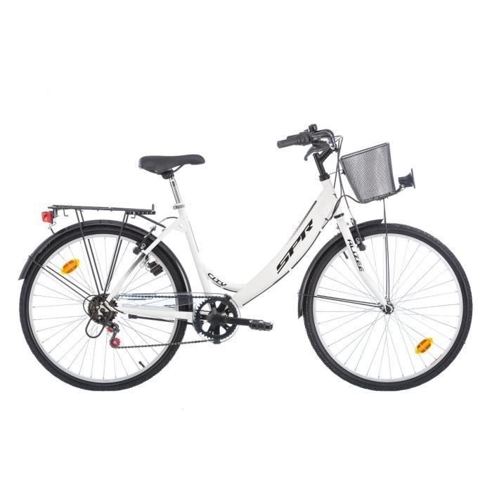 Vélo avec cadre acier rigide, blanc, frein avant et arriere V brake, dérailleur arriere, pneus 26", poignées PVC, 6 vitesses indexées par poignées tournantes, jantes alu, béquille.