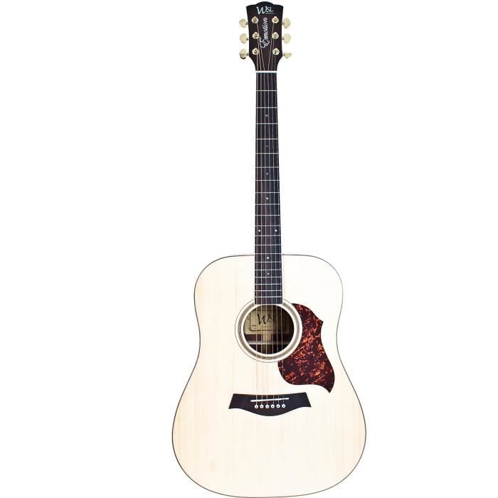 Guitare dreadnought acoustique avec table massive en épicéa. Rosace WSL. Eclisses et dos en palissandre. Manche collé lamelléen 5 parties en érable profil en V. Touche en palissandre. Rosette et Pickguard by WSL. Mécaniques a bain d'huile.