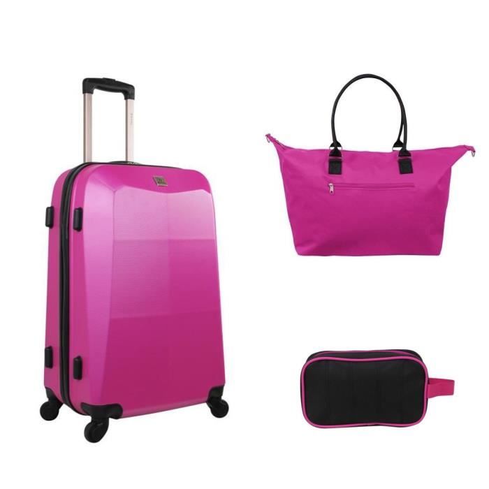 Set comprenant une valise cabine trolley 4 roues + un sac shopping + une trousse de toilette rose. Format cabine. Valise en ABS avec systeme trolley intégré a bouton poussoir, poignée de portage sur le dessus, intérieur entierement doublé. Fermeture par zip n°10.