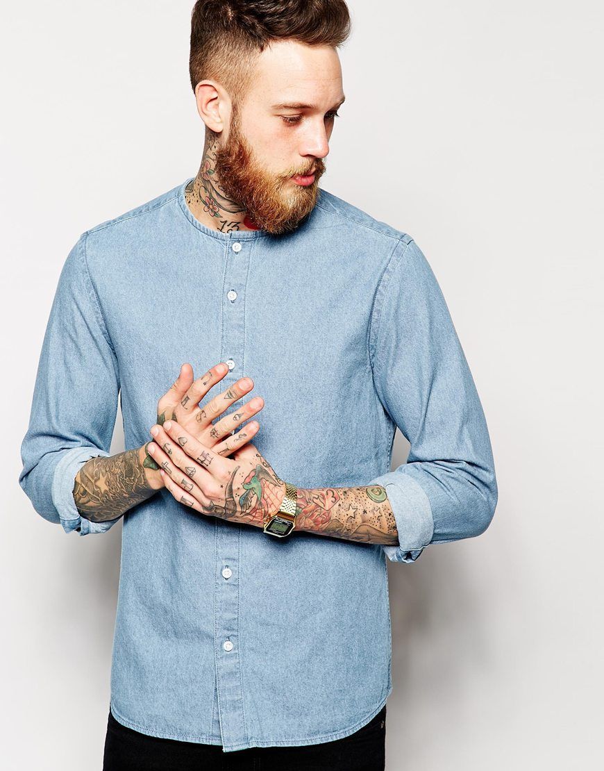 Achetez ASOS - Chemise en jean sans col à manches longues, jean chemise Asos pour homme sur Pickture, dans les tendances ASOS, Chemise, jean, Bleu