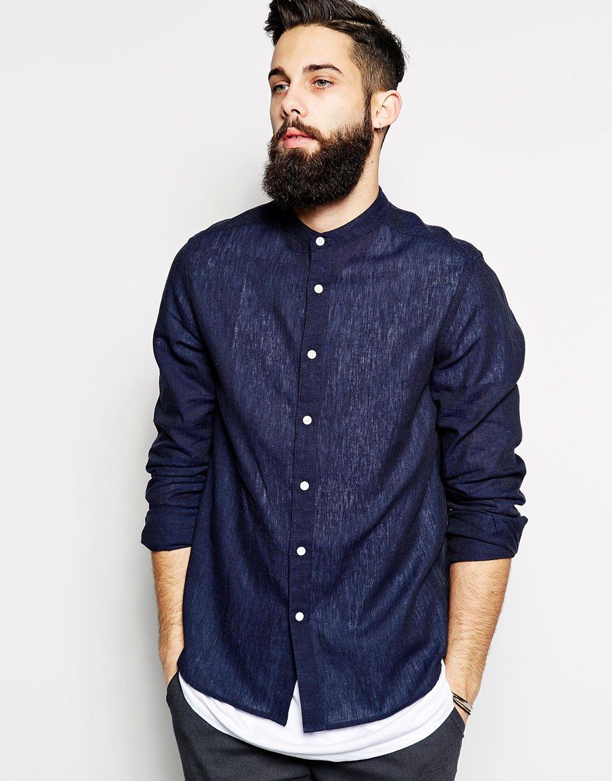 • ASOS - Chemise en lin mélangé à manches longues et col grand-père - Bleu marine