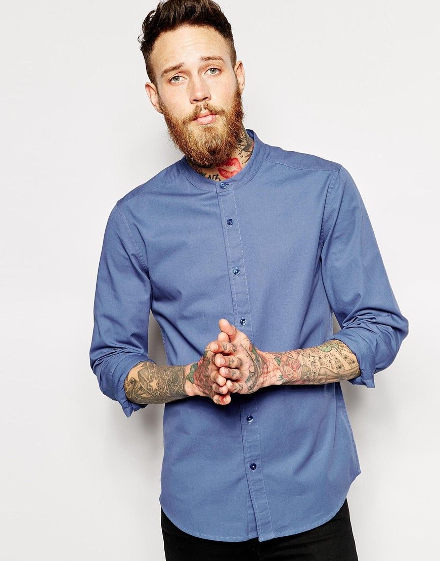 • ASOS - Chemise en sergĂ© Ă  manches longues et col grand-père - Bleu