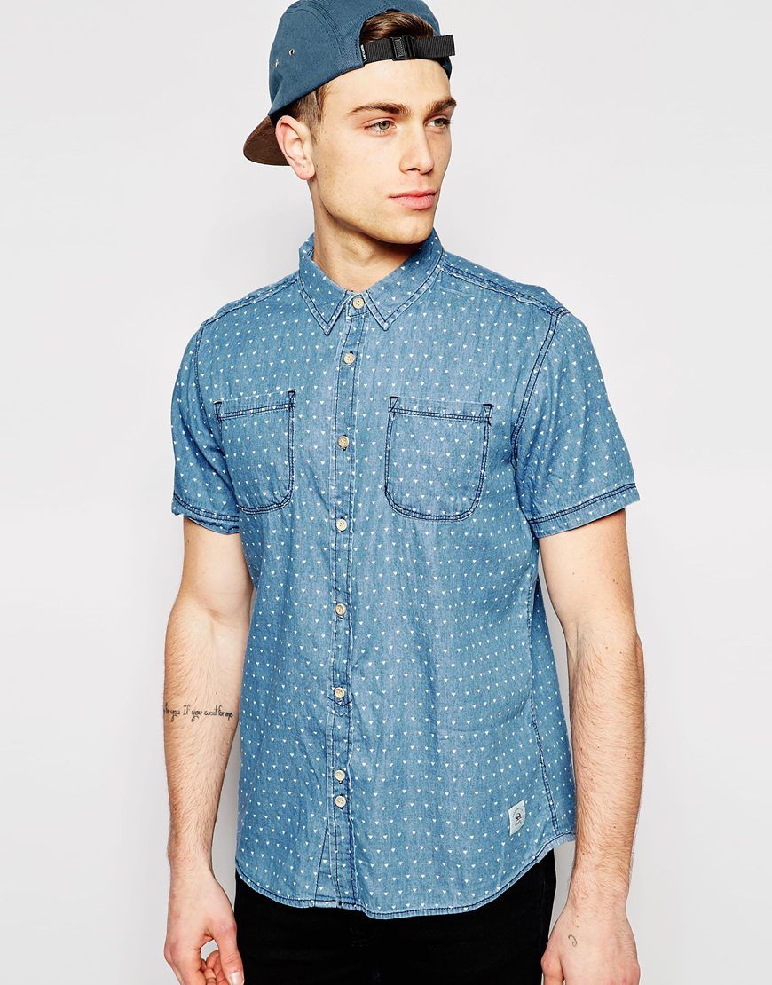 Bellfield - Short Sleeve Shirt Chambray Shirt with AO Print - Bleu chambray