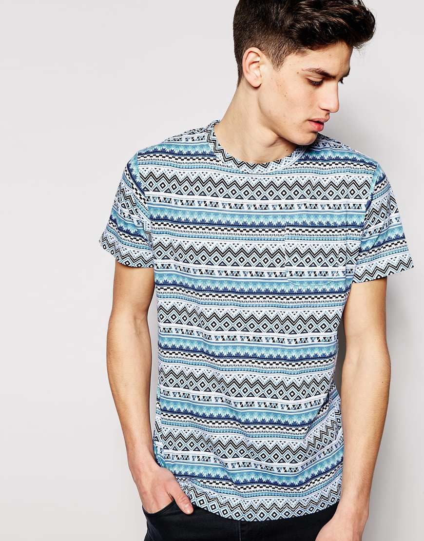 • Bellfield - T-shirt avec poche et imprimé aztèque sur l'ensemble - Bleu