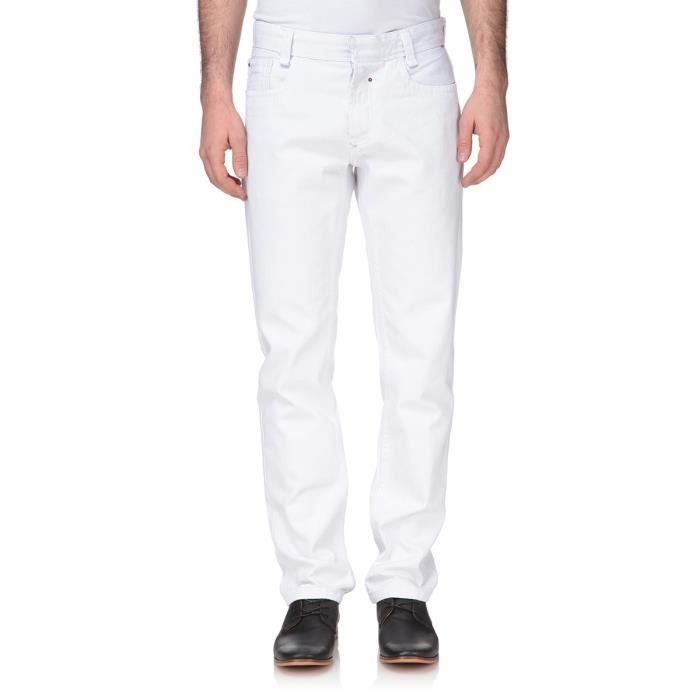 Blanc. Denim 98 % coton, 2 % élasthanne, zip. 5 poches.