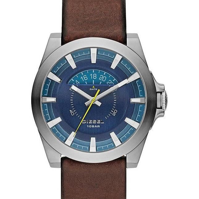 Montre en acier sur un bracelet en cuir de coloris marron. Cadran bleu doté d'un affichage analogique. Mouvement quartz. Montre résistant a une pression de 10 Atm.