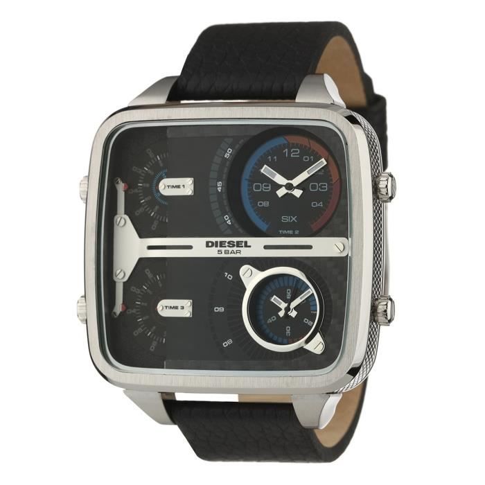 Montre en acier inoxydable sur un bracelet en cuir noir. Cadran noir, bleu et rouge, affichage analogique, chronographe. Mouvement quartz. Montre résistant a une pression de 5 Atm