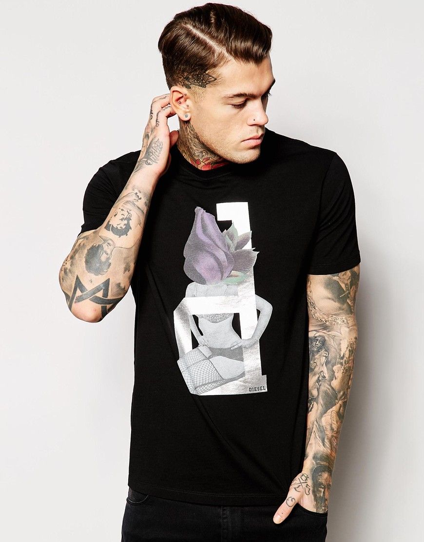 • Diesel - T-EFI - T-shirt à imprimé laminé motif fille et rose - Noir