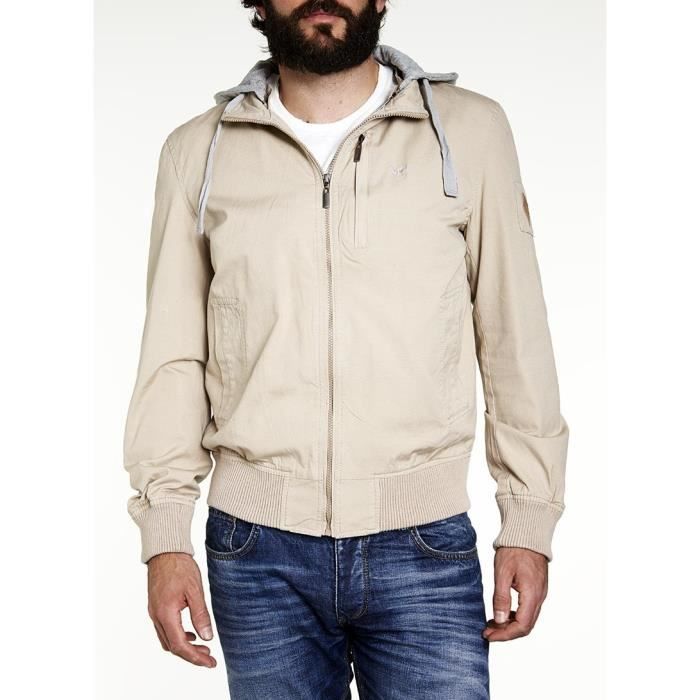 Blouson a capuche amovible, col montant, manches longues, beige. 100% coton. Fermeture zippée, 3 poches.